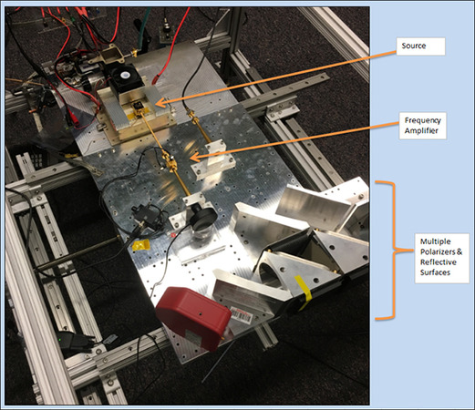 In NMRS, the beam is generated by a microwave synthesizer operating around 12.5 GHz. The output of the synthesizer enters an amplifier stage and then a frequency multiplier chain. The output is converted to 198 GHz. Output is 50 to 60 mW (at the source). The signal can be adjusted across 195 to 201 GHz and is typically operated at CW mode.