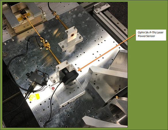 In this application, the question regarding the power measurement accuracy in the optical path started at the first measurement point, just after the frequency amplifier. After recalculating the output to watts, the source power generator indicated source power should be close to 60mW of average power. Using the Ophir 3A-P-THz thermal sensor, the value measured 51.9 mW.