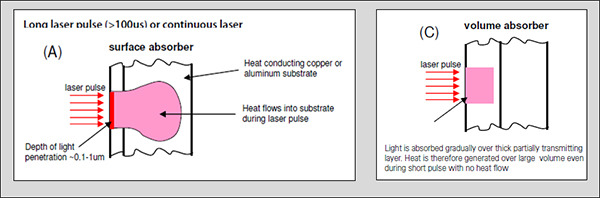 When measuring a laser with short pulses of tens of μs or less, the heat is deposited in a short time and cannot flow during the pulse (see illustration A below). Therefore, a surface absorber, which absorbs the energy in a thin surface layer, is not suitable. All the energy is deposited in a thin layer and that layer is vaporized.