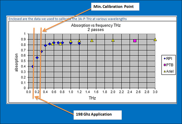 The last set of measurements in this investigation involved understanding why the 3A-P-THz sensor showed a drop of 66% in power from Source to Output, vs the Pyrocam IV intensity drop of only 48%. Upon analysis with factory engineering, the 3A-P-THz, although designed for terahertz measurement applications, is only calibrated for wavelengths from 0.3THz to 10THz, or 300GHz to 1000GHz. This application was operating at 198Ghz. The Absorption curve for the 3A-P-THz is shown below.Calibration Curve for 3A-P-THz. At 300Ghz, this sensor has an absorption of approximately 68%, whereas the application required calibration at 198Ghz where the absorption was approximately 40-45%.