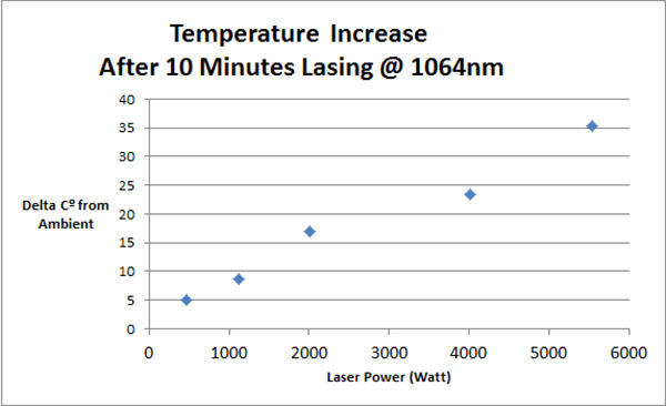 Due to high power laser irradiation through UVFS wedges, the LBS-300HP-NIR assembly temperature may increase. A thermal increase after 10 minutes of irradiation is shown in Chart 1. For example, at 4kW power the temperature is increased by 23.4˚C.