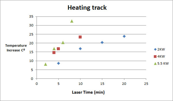 In order to prevent the LBS-300HP-NIR from overheating when using high power lasers, shorter periods of measurements are recommended. Heating behavior vs. time is shown in Chart 2. For example: After 15 minutes of 2kW lasing, the temperature is increased by 20.4˚C.