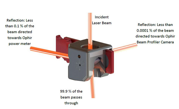 Using the LBS-300HP-NIR, a fraction of the incoming beam is reflected through the front surfaces of a pair of orthogonally oriented wedges. Less than 0.0001% (1/106) of the beam is then reflected towards the Ophir beam profiler camera and less than 0.1 % towards the optional Ophir power meter. The remaining 99.9% of the incident laser beam is transmitted. This enables beam shape, focal spot, beam waist, M², and overall power measurement of lasers up to 5 kW power or 15 MW/cm² power density from the laser under test.