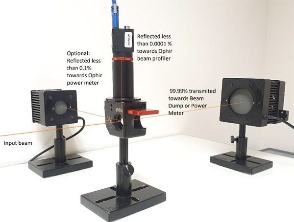 - Incident beam reflected with less than 0.0001% towards Ophir SP920 beam profiler via C-mount extension tube in order to reduce scatteringon the CCD and eliminate ambient light.