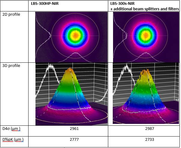 A comparison between the LBS-300HP-NIR and a conventional Ophir LBS-300s-NIR attenuator was conducted with Ophir BeamGage software and a camera, in order to verify the accuracy of the beam profile sample.