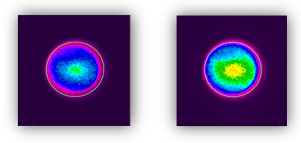 Figure 3 illustrates the output of two LED based, battery operated curing lights measured with a modified Spiricon laser beam profiling system. The false color scheme represents varying levels of irradiance falling on to the target. The dimensions of the light pattern are defined using percent of energy or percent of peak energy definitions. These measurements provide a sub-set of pixels on which to distribute the total power. The power measurement is divided by the total number of digital counts to obtain a count per intensity scale. From this each pixel is assigned a power over area value.