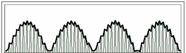 The peak connect algorithm finds the highest peak pulse, then, using the frequency value entered by the operator, it finds the other peaks and connects them to generate a smooth beam profile. It is important that the exact pulse rate be entered into pulse acquisition parameters. The software connects the pulse peaks based on the user input Laser Pulse Rate. If the actual and input frequencies are significantly different, the resulting profiles may be jagged (not smooth).