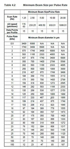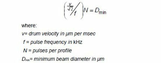 The following table gives a list of calculated minimum beam diameters at a given pulse rate for a desired number of pulses per profile. The more pulses per profile, the more accurate the measurement is likely to be. Due to the 45° angle of the slits to the direction of rotation, the actual velocity of the slits is the drum speed divided by the square root of two.