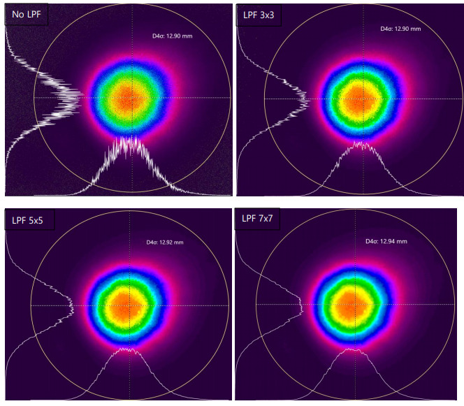 As demonstrated, the LPF function smoothed the speckle effect without compromising beam width (D4σ), intensity and other beam parameters.