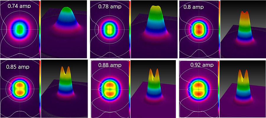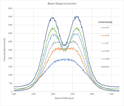 Figure 4 is a graph of the beam shape change vs current. It clearly shows that the Gaussian beam becomes flat top and shifts to dual mode once the current changes from 0.74 A to 0.92 A.