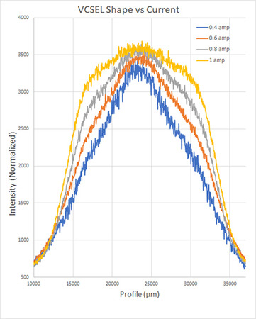 VCSELs are in a so called "LED mode" when there is only a low current applied. Once the current applied to the VCSEL rises, its beam profile changes to "Laser mode." This shift happens very rapidly and detecting exact electrooptical values during this process is highly important. This is one reason why the "Light-current-voltage (LIV) sweep test" is used to characterize a laser diode in operation. Observing beam profile changes during such a test provides important additional information. As the WB-I accessory, together with the camera and the BeamGage software, provides real time beam shape analysis and visualization, changes of the beam shape due to different applied currents can be easily detected.
