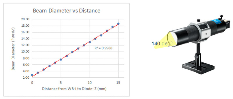 As shown in fig. 8, analyzing the beam diameter as function of the distance between the source and WB-I delivers additional insights. In our example, it shows linear behavior over the entire range. This enables accurate measurement of the divergence angles of the light sources. In order to calculate the divergence, it is essential to enter the distance between the light source and the diffuser of the WB-I accessory into the BeamGage software. Based on that input and the measured beam width (or a pre-selection by the user), the algorithm calculates the divergence displayed in mrad or deg°.