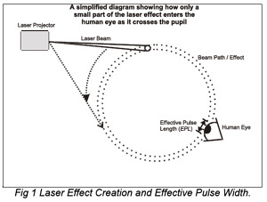 The results from surveying the exposure duration of a wide range of lightshow effects in differing venue sizes indicates that the time a beam takes to traverse a 7mm aperture ranges from several milliseconds for slow bright looking finger beam type effects, to tens of microseconds for the fastest moving effects. A large number of effects typically create effective pulse widths of several hundred microseconds.