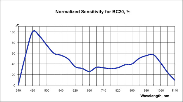 As is common with most silicon photodiode based detectors, the response to different wavelengths of laser radiation varies across the visible spectrum as a result of the related conversion efficiency of photodiode technology. This requires the meter to either be set to measure the correct wavelength, and, for those wavelengths that the meter does not have a pre-programmed builtin calibration factor, the meter reading must be adjusted manually to determine the true exposure level. Figure 2 shows the relative sensitivity of the BC20, while Table 1 lists a range of correction factors to be used for wavelengths across the visible spectrum.