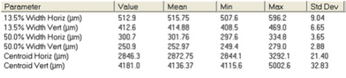 When this same experiment was repeated using the front surface reflection attenuator, the spiking effect was no longer visible and the beam measurement was ~850μm in one axis and 914μm in the other.