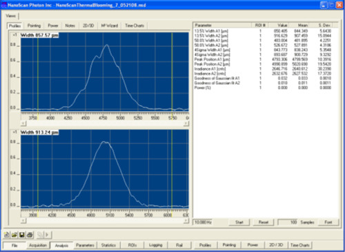 The measurements of the properly attenuated beam in the camera and the NanoScan were within 2% agreement, which is the specification for accuracy of these measurements. The beam measurements subject to thermal lensing were 30-40% low, indicating that a very rapid lensing effect was taking place in the first attenuator. Because this effect is so rapid, it is quite possible for such errors to go unnoticed. The measurements did not exhibit the “blooming” effect that might be expected from slower heating. Instead they achieved equilibrium within a matter of milliseconds.