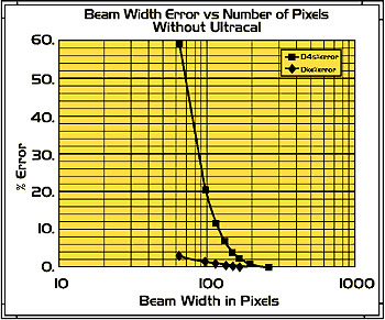 Figure 1 illustrates the calculated beam width error vs. beam size without all components of Spiricon's Ultracal algorithms. Note that in a 512X512 camera array, a beam width only as small as 64X64 is calculated at 60% error using the D4 method. This theoretically confirms previous reports of the errors generated by the presence of noise in D4 measurements. Also shown in Figure 1, is the beam width error calculated using the conventional knife-edge DKE method, which generates only 3% error at 64X64 beam size. Thus, while D4 is the theoretically correct way to measure a beam width, the practical problems of noise in the camera, have precluded its use up to this point.