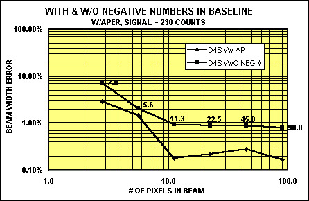 Figure 6 shows the effect of keeping negative numbers in the baseline. Without keeping negative numbers, only positive noise components are kept. This is the way most digitizers work. With only positive noise components, the measurement would attribute all of the positive noise components to be partially signal, and thus measure a beam larger than in actuality. In this figure we see that with an aperture, the D4 measurement is approximately 5 times better with the negative noise components considered, than without.
