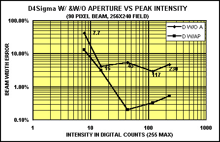 Figure 8 switches to measuring beam width accuracy vs. intensity, rather than beam size. The comparison is with and without an aperture. Here a large area beam covering 90 pixels and a 256X240 field is measured at full intensity, roughly 230 counts. The beam intensity is then reduced with neutral density filters, and the width measured. The D4 method with an aperture is able to measure with less than 0.5% error down to 43 counts, and less than 3% error all the way down to 15 counts in the beam peak. 15 counts in the beam peak is less than 6% of saturation. However, without an aperture, the measurement is in the 3-6% error range at all intensities, which is unacceptable. If the field was larger or the beam smaller, the differences between these two measurements are even more dramatic.