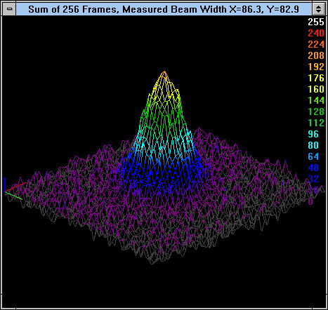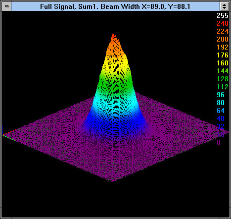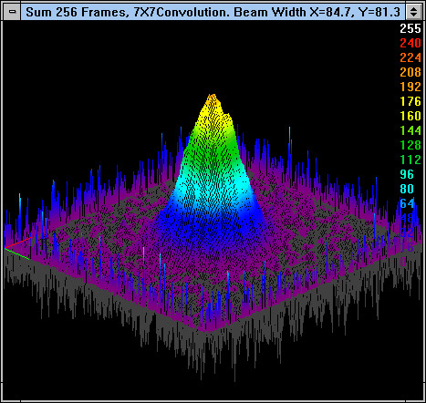 The utility of frame summing signal processing is shown with a low intensity beam. A laser beam signal was attenuated until it was buried in the noise so that the peak was approximately 1 digital count. The noise was approximately 3 digital counts. For reference, Figure 10 shows a 3D picture of the beam at its full intensity.
