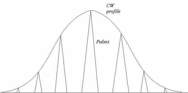 In the example sketched above, the laser pulses seven times as the slit traverses it. The beam profiler software connects the dots by looking at the peaks, and estimates the “CW profile.” As you can imagine, the more pulses in that profile, the better the software can estimate the real profile, giving a more accurate beam width result.