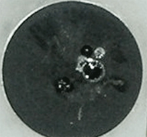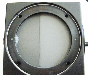 Two types of damage can occur from overheating of the sensor housing. The first is coating failure. This is fairly common and will result in a large discoloration of the coating surface. This discoloration is not removable by cleaning. In this situation the absorber must be replaced due to inconsistent absorption across the surface. Refer to Figure 3.