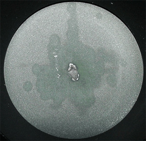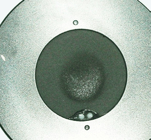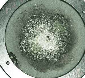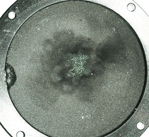 Explanation: Many times an out of tolerance condition can be explained simply by surface contamination induced by environ- mental conditions. Unfortunately, due to the different environments that sensors are used in, it is nearly impossible to conclude exactly what causes the contamination in each scenario. Welding environments are a common source of contamination; however any environment may allow foreign material to be deposited on the sensor if care is not taken. Grease from fingerprints is another common source of contamination and it can be burnt into the surface of the absorber. The use of a form of combustible material to determine beam location prior to sensor use can also contaminate your sensor. Burn paper or any other combustible material used near the sensor can slowly deposit contaminants onto the surface. Unfortunately the contamination can be gradual and uniform in distribution, preventing the end user from noticing a change in the shade of the coating Please refer to Figures 1 and 2.