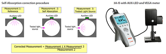 Ophir integrating spheres with detectors are calibrated over their specified spectral range. The IS-1 and 3A-IS models have an integral detector and the flexible IS6 offers several models with the optical sensor as an integral part of the system precisely calibrated together with the integrating sphere. The IS6 is also available uncalibrated for applications where the customer wants to use his own sensor and setup or does not need a sensor such as when using the sphere as a uniform light source. The integrating spheres are in general calibrated with a light source that is located far from the port so that it does not affect the reflective geometry of the sphere. When measuring a source of light that is located at or close to a sphere port, any reflective (or even partially reflective surfaces on the light source will contribute to the reflective surface area of the sphere, changing its calibration to read higher than it should. Therefore, light sources should be kept as far as practical from the sphere port and its surfaces should be as non-reflecting as possible. If this is not possible, see below.