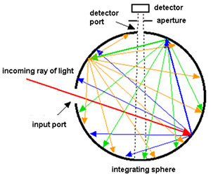 An integrating sphere collects electromagnetic radiation from a source usually external to the optical device, usually for flux measurement or optical attenuation. Radiation introduced into an integrating sphere strikes the reflective walls and undergoes multiple diffuse reflections. After numerous reflections, the radiation is dispersed highly uniformly at the sphere walls. The resulting integrated radiation level is directly proportional to the initial radiation level and may be measured easily using a detector.