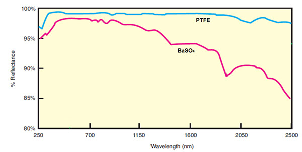 The IS-1 and IS6 integrating spheres use a solid PTFE type reflectance material and the 3A-IS uses the sprayed on BaSO4 material. The PTFE material exhibits very high diffuse reflectance over the 250 - 2500 nm spectral range with reflectance greater than 99% between 400 nm and 1500 nm.