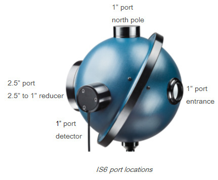 We will now describe the configurable Ophir IS6 5.3" integrating sphere. The port size and locations on the integrating sphere are important considerations when selecting a sphere for the intended applications. A sphere port adds functionality to an integrating sphere, but at the same time, diminishes the uniformity of the light distribution inside the sphere. The ratio of the total port area to the area of the internal wall of a sphere is called the port fraction. The port fraction parameter constitutes a measure of sphere performance in accuracy. An integrating sphere with a low port fraction provides better performance than a high port fraction sphere.