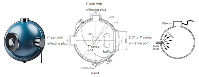 Divergent beams are defined here as beams with more than ±15º divergence. It such a case the sphere has to be arranged that the internal baffle should block the detector from direct exposure to the light source. The baffle is made of the same reflecting PTFE material as the other reflective surfaces.