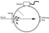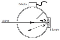 To measure reflectance, a sample is held opposite the input port and irradiated by an incident beam through the entrance port. Total reflected radiation is spatially integrated by the sphere and measured by a baffled detector. Using a normal-incidence sample holder, which reflects the specular beam back out of the input port, can eliminate the specular component of the reflective radiation. The reflectance of a sample relative to a known standard can be calculated by measuring both and taking their ratio. The sample and standard should have a similar reflectance to avoid errors caused by sample reflectivity.