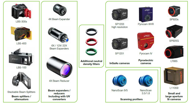 Our unparalleled collection of cameras, beam splitters/attenuators, beam expanders, beam reducers, UV to visible light converters, and other components that allow you to profile almost any beam desired. You can profile powers up to thousands of watts using our beam attenuators. You can profile a very wide range of wavelengths from far UV to far IR. You can profile a focal spot of a converging beam or a diverging beam.